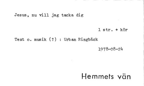//// Jesus, nu vill jag tacka dig //// 1 str. + kör //// Text o. musik (?) : Urban Ringbäck //// 1978-08-24 //// Hemmets vän ////