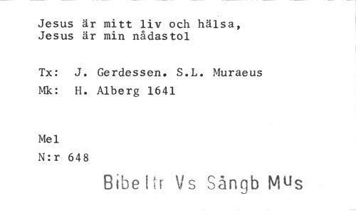 //// Jesus är mitt liv och hälsa, Jesus är min nådastol //// Tx: J. Gerdessen. S.L. Muraeus Mk: H. Alberg 1641 //// Mel //// N:r 648 //// Bibe Vs Sångb Mus ////