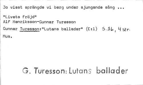 //// Jo visst sprängde vi berg under sjungande sång ... //// "Livets fröjd" //// Alf Henriksson-Gunnar Turesson //// Gunnar Turesson:"Lutans ballader" (E:1) 5-54 1-1 stf-- Mus. //// G. Turesson: Lutans ballader ////