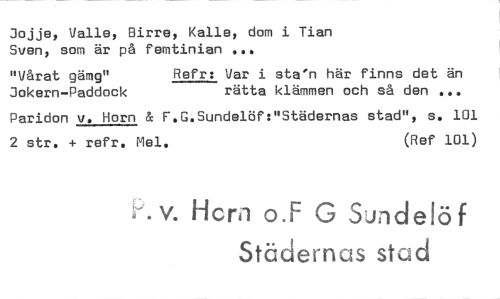 //// Jojje, Valle, Birre, Kalle, dom i Tian Sven, som är på femtinian //// "Vårat gämg" Refr: Var i sta'n här finns det än //// Jokern-Paddock rätta klämmen och så den ... //// Paridon v. Horn & F.G.Sundelöf:"Städernas stad", s. 101 //// 2 str. refr. Mel. (Ref 101) //// Hcrn o.F G Sundelöf //// Städernas stad ////
