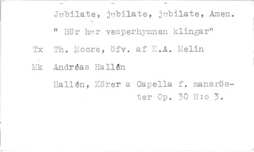 //// Jubilate, jubilate, jubilate, Amen. " Hör hur vesperhymnen klingar" //// Th. Ioore, öfv. af K.A. Melin //// Mk Andras Hallen //// Hall4n, Körer a Capella f. mansrös- //// ter Op. 30 N:o 3. ////