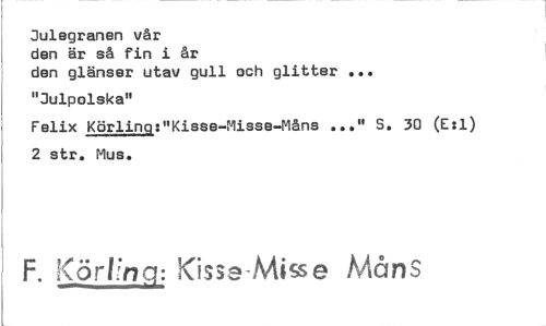 //// Julegranen vår //// den är så fin i år //// den glänser utav gull och glitter • • //// "Julpolska" //// Felix Körlinq:"Kisse-Misse-Måns S. 30 (E:1) //// 2 str. Mus. //// F. :CörUng: Kisse-Misse Måns ////