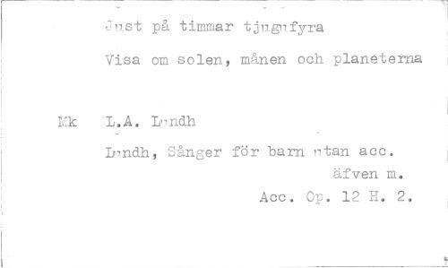 //// Just på timmar tjugufyra //// Visa om solen, månen och planeterna //// Mk L.A. Lundh //// Lundh, Sånger för barn utan acc. //// äfven m. Acc. Op. 12 H. 2. ////