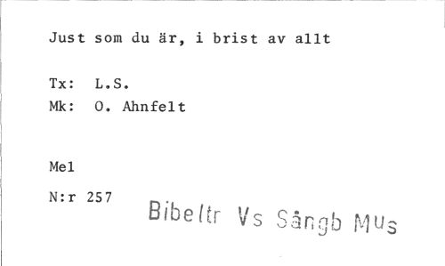 //// Just som du är, i brist av allt //// Tx: L.S. //// Mk: 0. Ahnfelt //// Mel //// N:r 257 Bibeltr Vs Sångb N/lus ////