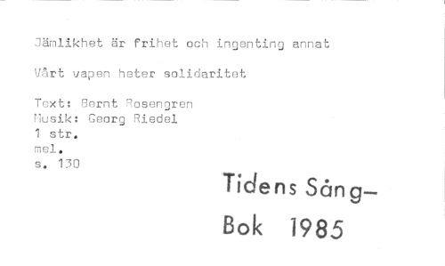 //// Jämlikhet är frihet och ingenting annat Vårt vapen heter solidaritet //// Text: 3ernt Rosengren Musik: Georg Riedel //// 1 str. //// mel. //// s. 130 //// Tidens Sång— //// Bok 1985 ////