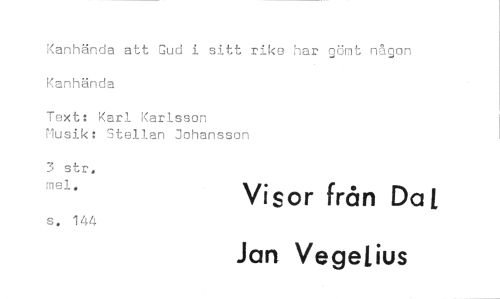//// Kanhända att Gud i sitt rike har gömt någon Kanhända //// Text: Karl Karlsson Musik: Stellan Johansson //// 3 str. //// mel. Visor från Dal //// s. 144 //// Jan Vegelius ////