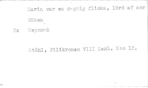 //// Karin var en dngtig flicka, lärd af mor Göken //// Tx T'lerom7k //// Ståhl, Filikromen VIII Saml. ':o 12. ////