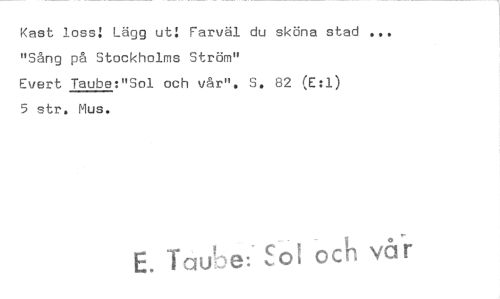 //// Kast loss! Lägg ut: Farväl du sköna stad "Sång på Stockholms Ström" //// Evert Taube:"Sol och vår". S. 82 (E:1) 5 str. Mus. //// ••• //// E. Taue: $o1 och var ////