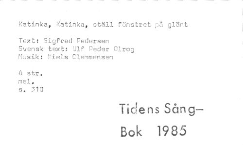 //// Katinka, Katinka, ställ fönstret på glänt //// Text: Sigfred Pedersen //// Svensk text: Ulf Peder Olrog Musik: Niels Clemmensen //// 4 str, mol. //// s, 310 //// Tidens Sång— //// Bok 1985 ////