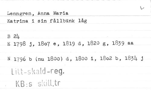 //// Lenngren, Anna Maria Katrina i sin fållbänk låg //// B 24 //// E 1798 j, 18o7 e, 1819 d, 1820 g, 1839 aa //// N 1796 b (nu 1800) d, 1800 i, 18o2 b, 1854 i //// Lit-skald-reg, //// KB:s s'Aitt:tr ////