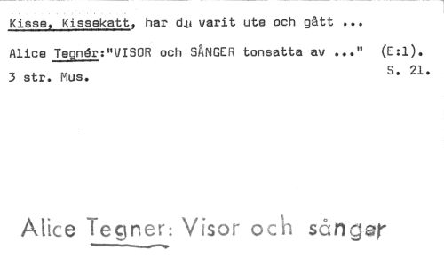 //// Kisse, Kissekatt, har d.j varit ute och gått ... //// Alice Tegnår:"VISOR och SÅNGER tonsatta av ..." (E:1). 3 str. Mus. S. 21. //// Alice Tejner: Visor och sångan ////