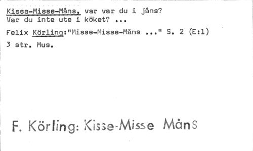 //// Kisse-Misse-Måns, var var du i jåns? Var du inte ute i köket? //// Felix Körlinq:"Misse-Misse-Måns ..." 9. 2 (E:1) 3 str. Mus. //// F. Körting: Kis3e-Misse Måns ////