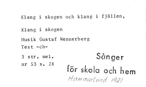 //// Klang i skogen och klang i fjällen, Klang i skogen //// Musik Gustaf Wennerberg Text -ch- //// 3 str. mel. Sånger //// nr 53 s. 28 för skola och hem //// Ha/pinar/04y /9.2 //// /