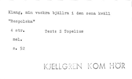 //// Klang, min vackra bjällra i den sena kväll "Res polska" //// 4 str. Text: Z Topelius //// mel. //// s. 52 //// k rr kOM ////