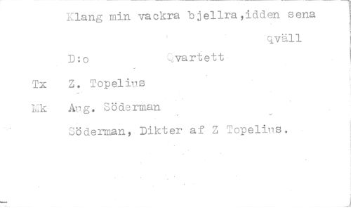 //// 1 Klang min vackra bjellra,idden sena //// qväll //// D:o vartett I //// Tx Z. Topelius //// Lik An g. Söderman //// Söderman, Dikter af Z Topelius. ////