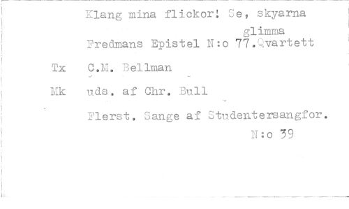 //// Klang mina flickor! Se, skyarna //// glimma //// Fredmans Epistel N:o 77.Qvartett //// Tx C.M. Bellman //// Mk uds. af Chr. Bull //// Flerst. Sange af Studentersangfor. //// N:o 39 ////