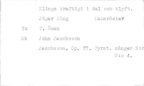 //// Klinga kraftigt i dal och klyft. //// Jägar Sång Mansröster //// Tx V. Öman //// Mk John Jacobsson //// Jacobsson, Op. 27. Fyrst. sånger N:c //// N:o 4. ////