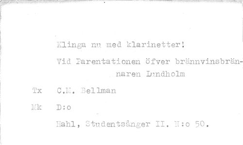 //// wir.~9~~~5,44~~9TOR //// Klinga nu med klarinetter! //// Vid Parentationen öfver brännvinsbrän //// naren Lundholm //// Tx C.M. cellman //// Lik D:o //// Hahl, Studentsånger II. U:o 50. ////