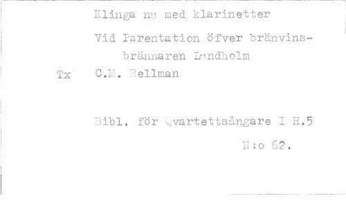 //// Klinga nu med klarinetter //// Vid rarentation_öfver bränvinsbrännaren Lnndholm //// Tx C.M. cellman //// 3ibl. för vartettsångare I H.5 //// N:o 62. ////