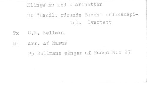 //// Klinga m med klarinetter //// Ur "Handl. rörande S'acchi ordenskapitel. Qvartett //// Tx C.M. Bellman //// Hk arr. af Nasus //// 25 Bellmans sånger af Nasus N:o 25 ////