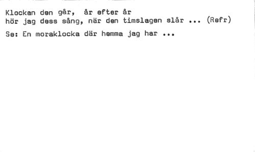 //// Klockan den går, år efter år //// hör jag dess sång, när den timslagen slår (Refr) //// Se: En moraklocka där hemma jag har ... ////