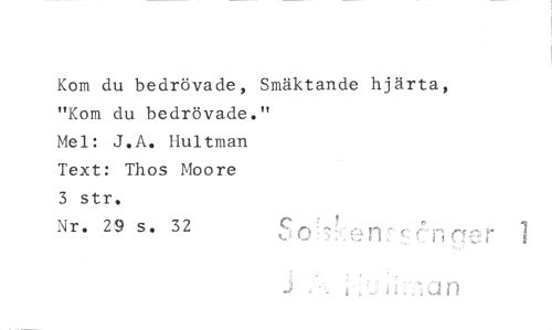 //// Kom du bedrövade, Smäktande hjärta, "Kom du bedrövade." //// Mel: J.A. Hultman //// Text: Thos Moore //// 3 str. //// Nr. 29 s. 32 //// ct ////