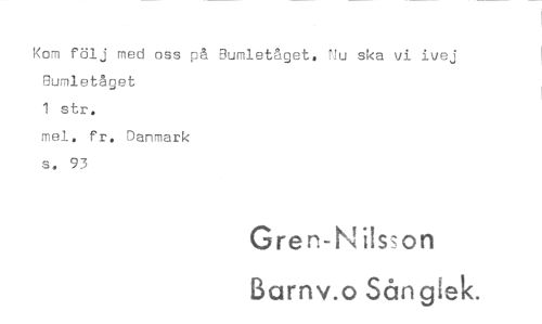//// Kom följ med oss på Bumletåget. Nu ska vi ivej Bumletåget //// 1 str. //// mel. fr. Danmark //// s. 93 //// Gren-N ils,on //// Barnv.o Sånglek. ////