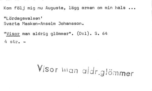 //// Kom följ mig nu Augusta, lägg armen om min hals ... //// "Lördagsvalsen' //// Svarta Masken-Anselm Johansson. //// "Visor man aldrig glömmer". (D:1). S. 64 4 str. - //// Visor Illan Jidr.giömmer ////