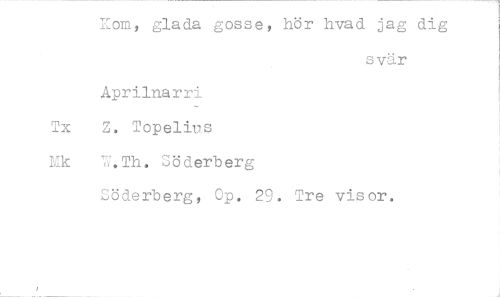 //// Kom, glada gosse, hör hvad jag dig //// svär //// Aprilnarri //// Tx Z. Topeliu.s //// Mk W.Th. Söderberg //// Söderberg, Op. 29. Tre visor. ////