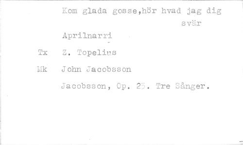 //// Kom glada gosse,hör hvad jag dig //// svär //// Aprilnarri //// Tx Z. Topelius //// Mk John Jacobsson //// Jacobsson, Op. 25. Tre Sånger. ////
