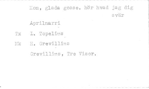 //// lom, glada gosse. hör hvad jag dig //// svär //// Aprilnarri //// Tx L, Topelius //// rik H. Grevillins //// Grevillius, Tre Visor. ////