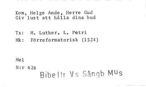 //// Kom, Helge Ande, Herre Gud Giv lust att hålla dina bud //// Tx: M. Luther, L. Petri //// Mk: Förreformatorisk (1524) //// Mel //// N:r 626 //// Bibeitr Vs Sångb Mus ////