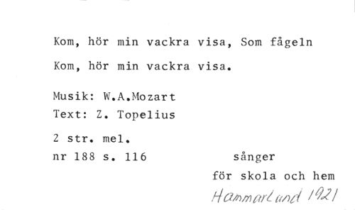 //// Kom, hör min vackra visa, Som fågeln Kom, hör min vackra visa. //// Musik: W.A.Mozart //// Text: Z. Topelius //// 2 str. mel. //// nr 188 s. 116 sånger //// för skola och hem //// Hammar/ft/7d /92 //// /