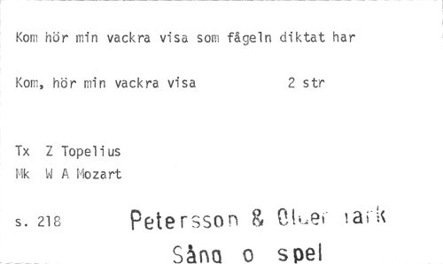 //// Kom hör min vackra visa som fågeln diktat har //// Kom, hör min vackra visa 2 str //// Tx Z Topelius //// Mk W A Mozart //// s. 218 Petersson & //// Såna o spel ////