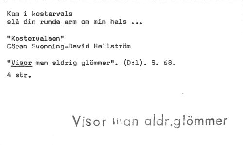 //// Kom i kostervals //// slå din runda arm om min hals ... //// "Kostervalsen" //// Göran Svenning-David Hellström //// "Visor man sldrig glömmer". (D:1). S. 68. 4 str. //// Visor titan aidngiömmer ////