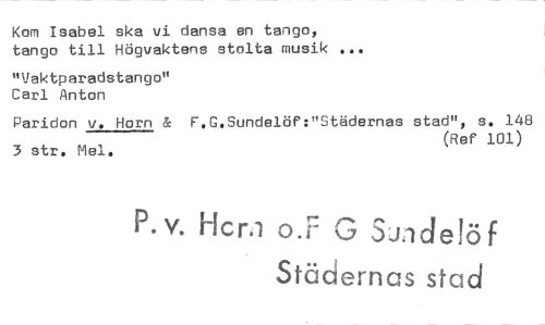 //// Kom Isabel ska vi dansa en tango, tango till Högvaktens stolta musik ... //// "Vaktparadstango" Carl Anton //// Paridon y. Horn & F.G.Sundelöf:"Städernas stad", s. 148 3 str. Mal. (Ref 101) //// P.v. licrå o.F G Sndelöf //// Städernas stad ////