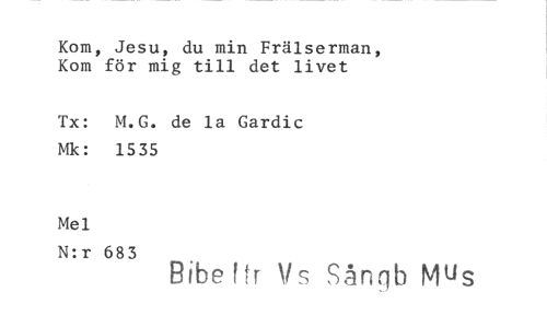 //// Kom, Jesu, du min Frälserman, Kom för mig till det livet //// Tx: M.G. de la Gardic Mk: 1535 //// Mel //// N:r 683 //// Bibe Hr Vs Sångb Mus ////