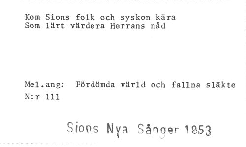 //// Kom Sions folk och syskon kära Som lärt värdera Herrans nåd //// Mel.ang: Fördömda värld och fallna släkte N:r 111 //// Siors Nya Sånfler 1953 ////