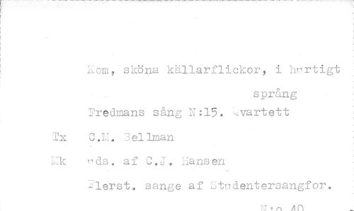 //// Kom, sköna kållarflickor, i hi'rtigt //// språng //// Fredmans sång N:15. ',vartett //// Tx C.M. Bellman //// rds. af C.J. Hansen //// 1erst. sange af Studentersangfor. //// 7frl An ////