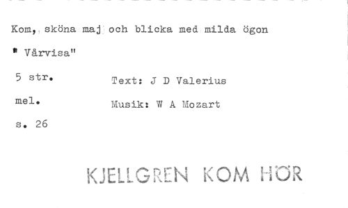 //// Kom, sköna maj'och blicka med milda ögon i Vårvisa" //// 5 str. Text: J D Valerius //// mel. Musik: W A Mozart //// s. 26 //// KJE ////