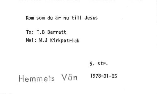 //// Kom som du är nu till Jesus //// Tx: T.B Barratt //// Mel: W.J Kirkpatrick //// 5. str. //// Hemmets Vän 1978-01-05 ////