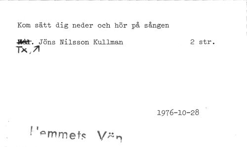 //// Kom sätt dig neder och hör på sången //// IIMMe. Jöns Nilsson Kullman 2 str. //// TX,71 //// 1976-10-28 //// mmetR Vgn ////