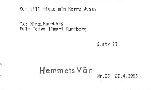 //// Kom till mig,o min Herre Jesus. //// Tx: Nino_Runeberg //// Mel: Toivo Ilmari Runeberg //// 2.str ?? //// Hemmets Vä n //// Nr.I6 21.4.1966 ////