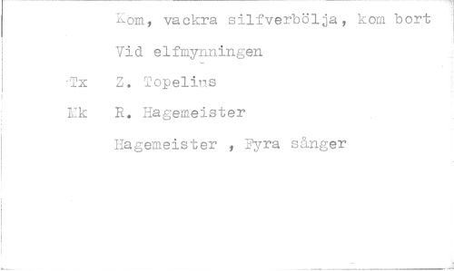 //// Kom, vackra silfverböljal kom bort Vid elfmynningen //// -Tx Z. Topelins //// Mk R. Hagemeister //// Hagemeister , Fyra sånger ////