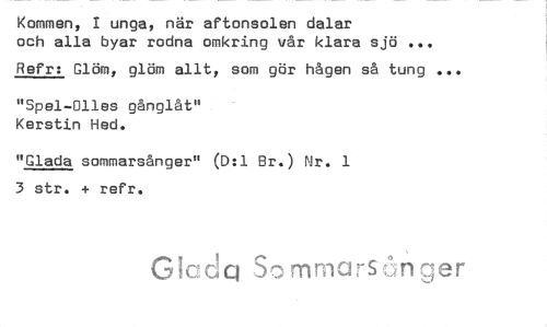 //// Kommen, Y unga, när aftonsolen dalar //// och alla byar rodna omkring vår klara sjö ... //// Refr: Glöm, glöm allt, som gör hågen så tung //// "Spel-011es gånglåt" Kerstin Hed. //// "Glada sommarsånger" (D:1 Br.) Nr. 1 3 str. + refr. //// Giadq Snmmarsån* er ////