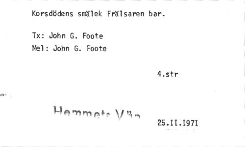 //// Korsdödens smälek Frälsaren bar. //// Tx: John G. Foote Mel: John G. Foote //// 4.str //// 1-103.inlryirNkf //// 25.11.1971 ////
