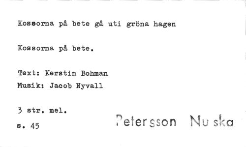 //// Kossorna på bete gå uti gröna hagen Kossorna på bete. //// Text: Kerstin Bohman Musik: Jacob Nyvall //// 3 str. mel. //// s. 45 s a ////