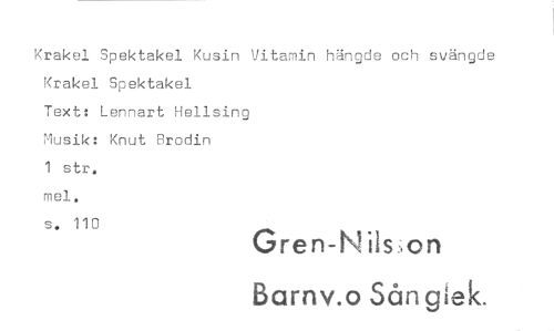 //// Krakel Spektakel Kusin Vitamin hängde och svängde Krakel Spektakel //// Text: Lennart Hellsing //// Musik: Knut Brodin //// 1 str. //// mei. //// s. 110 Gren-Nils ,on //// Barnv.o Sång ek. ////