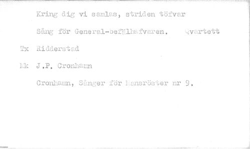 //// Kring dig vi saulas, striden töfvar //// Sång för General-bef:ahafVaren. vartett //// Tx Ridderstad //// kk 3.P. Cronhaun //// Cronhamn, Sånger för lAnsröster nr 9. ////