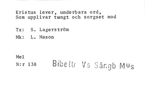 //// Kristus lever, underbara ord, //// Som upplivar tungt och sorgset mod //// Tx: S. Lagerström Mk: L. Mason //// Mel //// N:r 138 Bibeitr Vs Sångb Mus ////